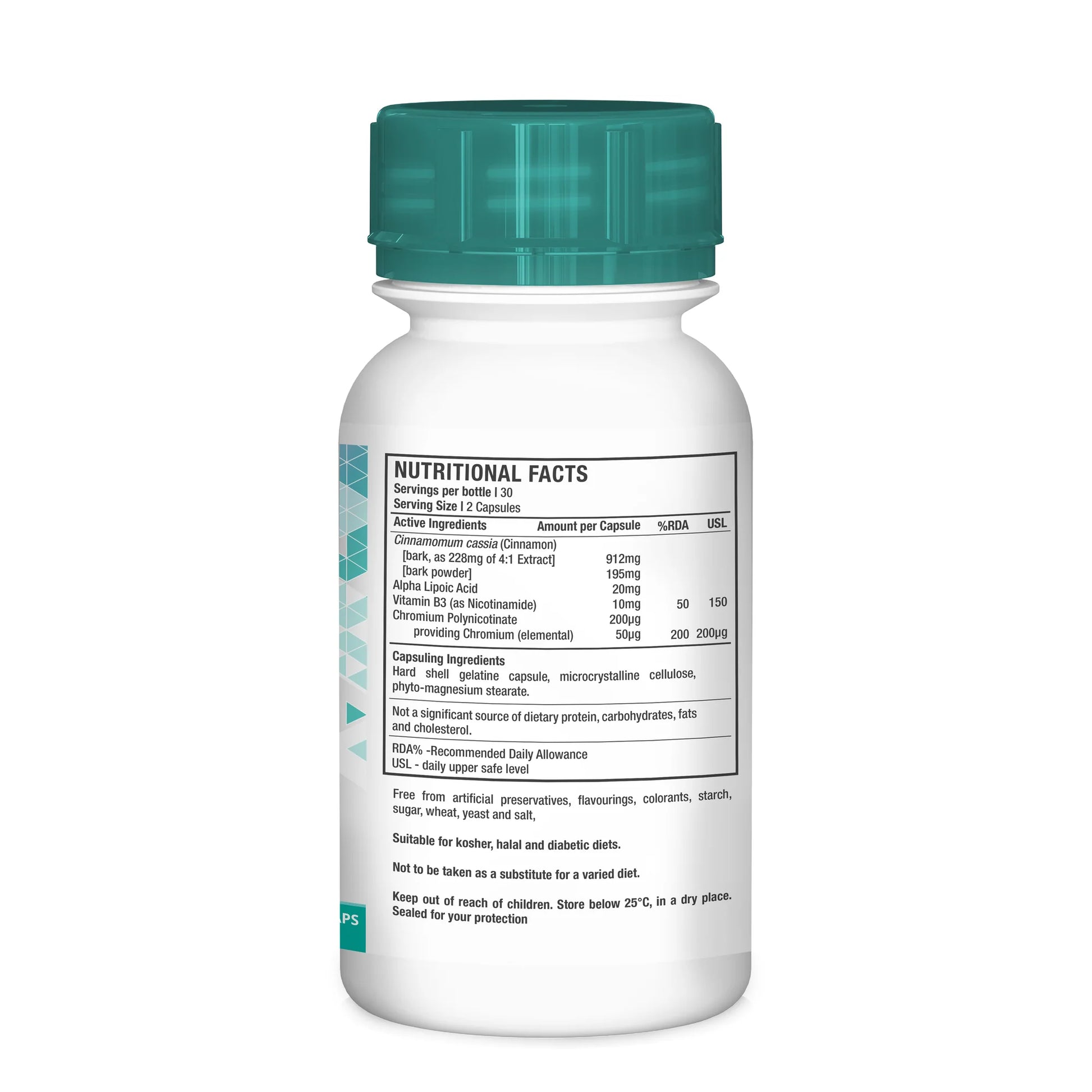Cinnamomum cassia (Cinnamon) [bark, as 228mg of 4:1 Extract] 912mg, [bark powder] 195mg, Alpha Lipoic Acid 20mg, Vitamin B3 (as Nicotinamide) 10mg, Chromium Polynicotinate 200µg, providing Chromium (elemental) 50µg.