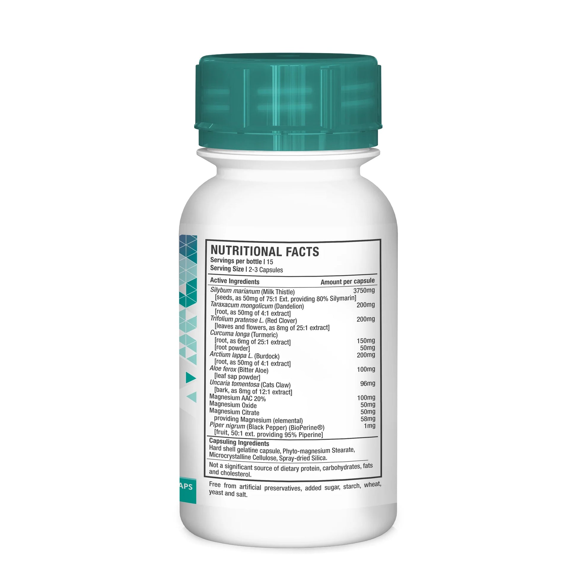 Silybum marianum (Milk Thistle) 3750mg, [seeds, as 50mg of 75:1 Ext. providing 80% Silymarin], Taraxacum mongolicum (Dandelion) 200mg, [root, as 50mg of 4:1 extract], Trifolium pratense L. (Red Clover) 200mg, [leaves and flowers, as 8mg of 25:1 extract], Curcuma longa (Turmeric) [root, as 6mg of 25:1 extract] 150mg, [root powder] 50mg, Arctium lappa L. (Burdock) 200mg,[root, as 50mg of 4:1 extract], Aloe ferox (Bitter Aloe) 100mg, [leaf sap powder] Uncaria tomentosa (Cats Claw) 96mg, [bark, as 8mg of 12:1 extract] Magnesium AAC 20%100mg, Magnesium Oxide 50mg, Magnesium Citrate 50mg, providing Magnesium (elemental) 58mg, Piper nigrum (Black Pepper) (BioPerine®) 1mg, [fruit, 50:1 ext. providing 95% Piperine].