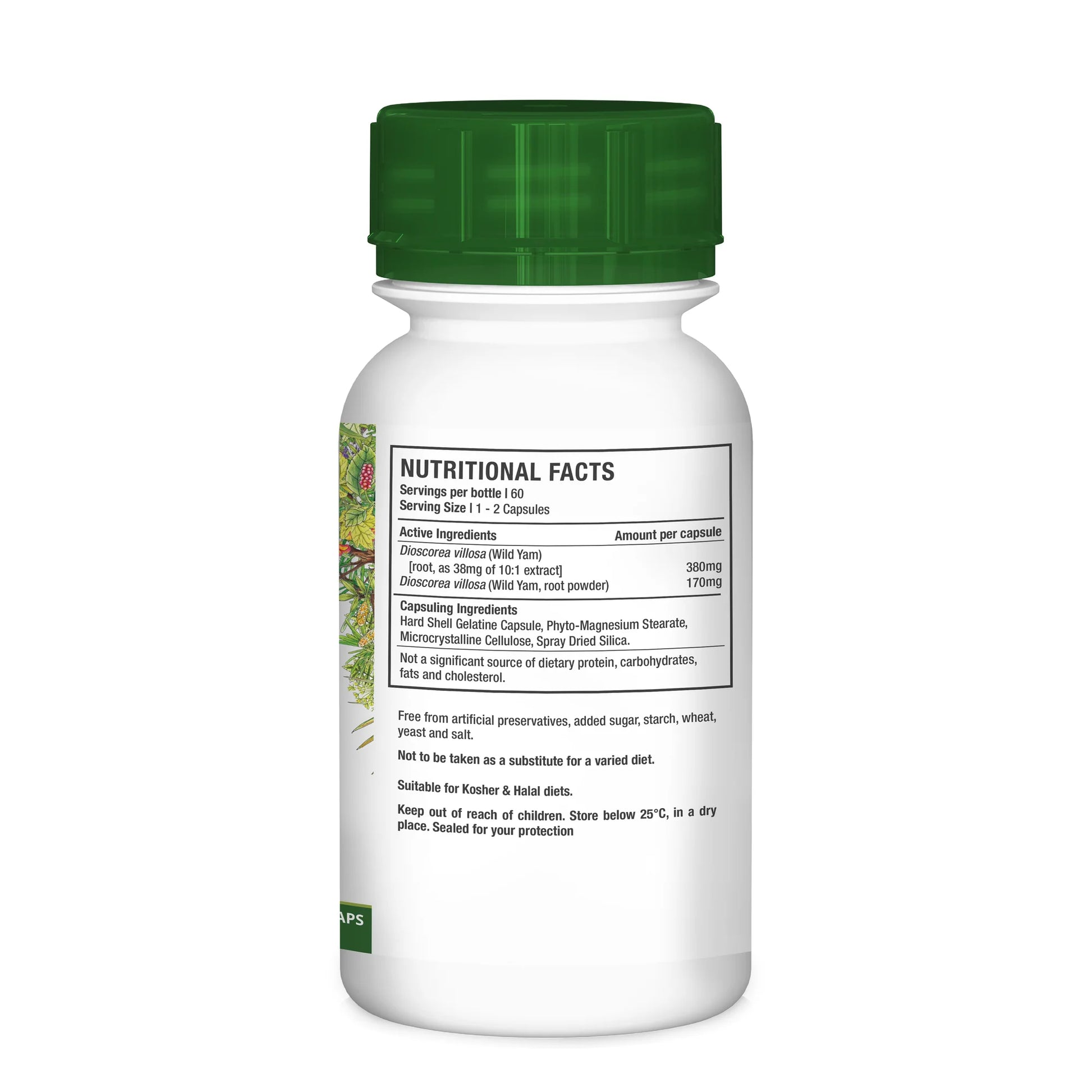 Dioscorea villosa (Wild Yam) [root, as 38mg of 10:1 extract] 380mg. Dioscorea villosa (Wild Yam, root powder) 170mg.